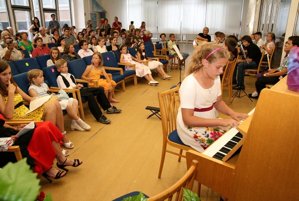 Vo štvrtok 16. júna o 18.00 h sa v knižnici uskutočnil koncoročný koncert hudobných tried p. Váryho a p. Mikulášovej. Hľadisko sa do posledného miesta zaplnilo účinkujúcimi, ich rodičmi, priateľmi, ale aj náhodnými divákmi. Predviedli, čo sa za tento školský rok na hudobnej naučili a tí starší sa stali absolventami. Niektorí s nutnou dávkou nervozity, iní suverénejší. Spievalo sa, hralo sa na gitarách, flautách a klavíri, jednoruč, obojruč, vo dvojici a dokonca aj v trojici. V príjemnej atmosfére koncert trval až do 19.30 h.