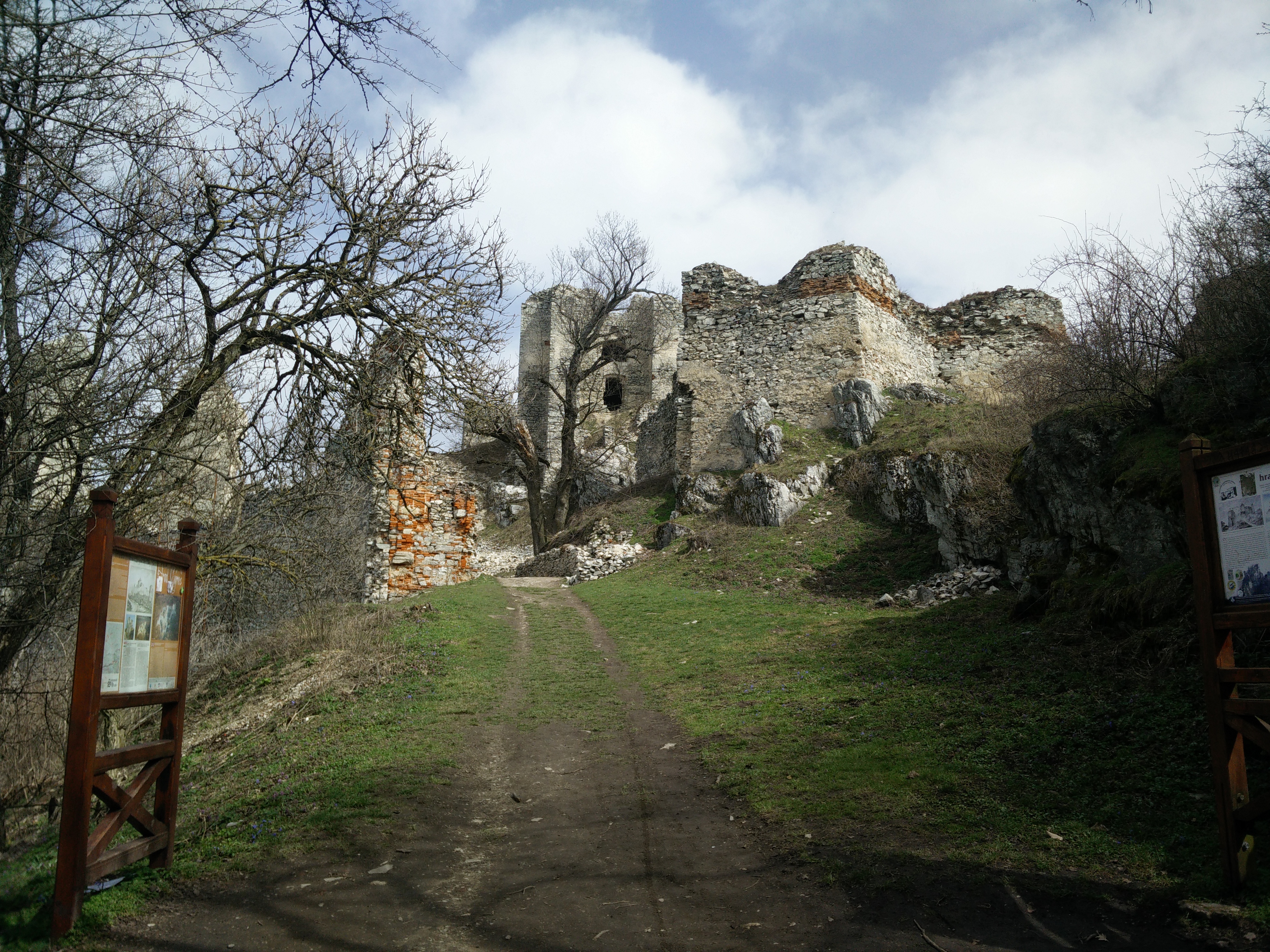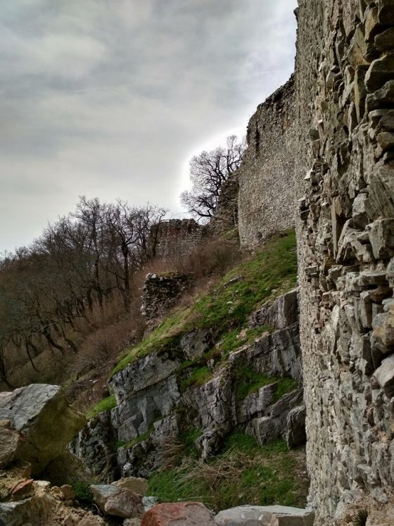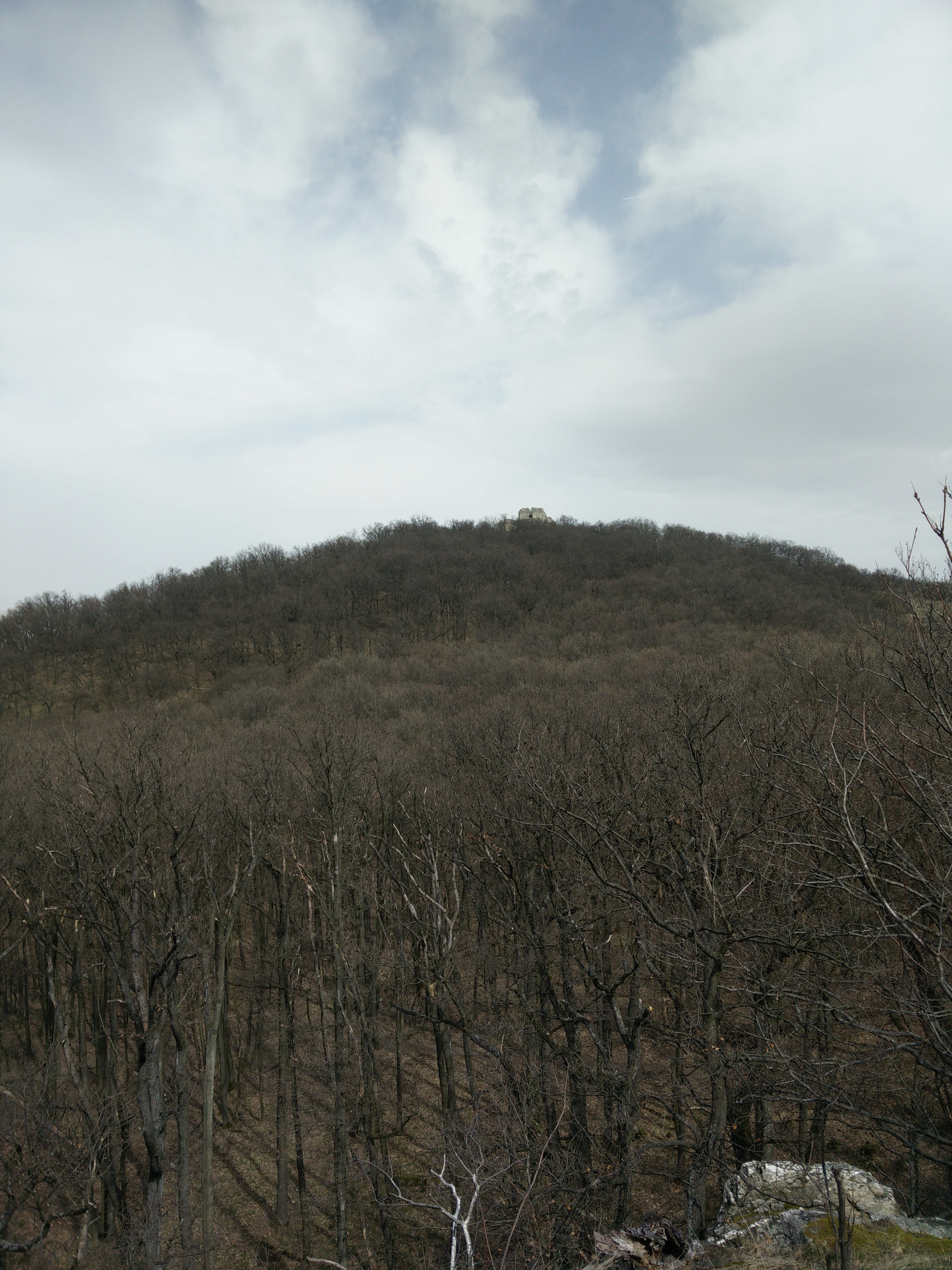 Cesta na hrad vedie klasickou lesnou cestou cez pekný dubový les. Škoda, že stromy sa ešte nezelenajú, určite je to krajšie v neskoršom období. Cesta ide stále hore a aj keď je terén ideálny, predsa sa trocha zadýchame. Po asi 35 minútach sa dostávame na malé rázcestie, kde si môžeme vybrať priamu cestu na hrad alebo krátku odbočku na výhľad z brala. My neváhame a vyberáme 5 minútovú odbočku na bralo. Nakoľko sa už dostávame nad úroveň lesa, naskytá sa nám prvý výhľad na okolie a obrysy hradu.
