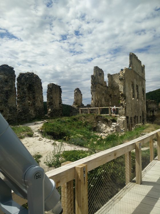 Prechádzame dreveným mostíkom k úplnému okraju hradieb, kde je pre návštevníkov umiestnený aj ďalekohľad. Výhľad je ozaj nádherný a nám praje aj počasie, takže sme veľmi spokojní. S ďalekohľadom dokonca vidno aj bralo Manínskej tiesňavy, ktorú sme síce nenavštívili, ale niečo si o nej môžete prečítať na tomto linku. Chvíľu sa kocháme výhľadom a prechádzame ešte zákutiami hradu, ktoré sú sprístupnené. V každej časti sú umiestnené podstavce, na ktorých je krátke info o hrade a mieste, kde sa nachádzate, čo je pre mňa príjemné prekvapenie. Hrad sme prešli za cca 30 minút aj s čítaním, robíme posledné fotky a pomaly sa poberáme naspäť.