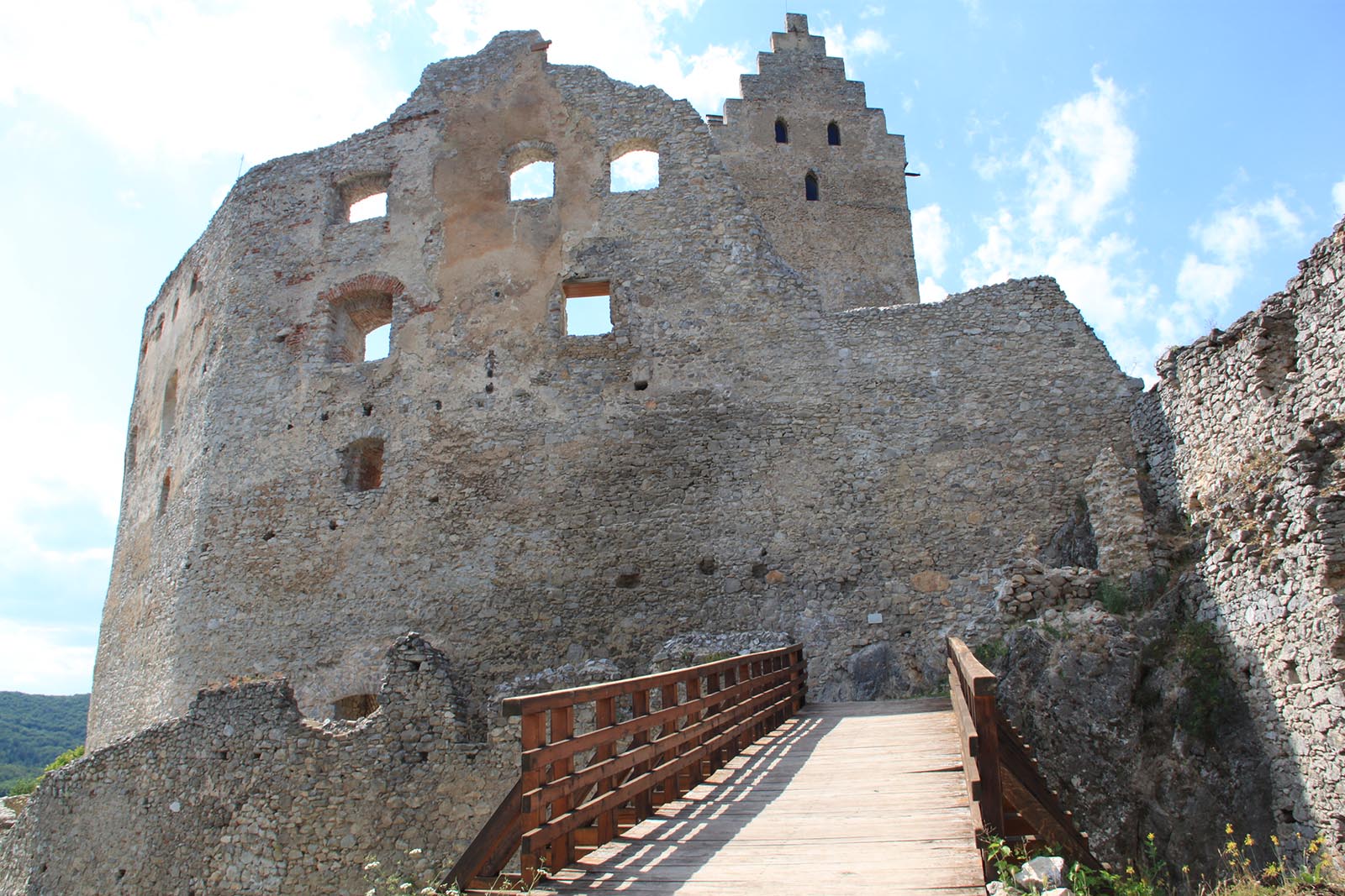 Samozrejme, asi najviac zaujme vysoká hradná veža, ktorá zatiaľ nie je sprístupnená. Dúfam však, že raz bude, pretože ten výhľad by stál za to. Výhľady sú však aj beztak krásne a je na čo pozerať. Celý areál zrúcaniny je prístupný aj formou balkónov, schodísk a jednej veže na druhej strane areálu. Stačí vyjsť z nádvoria a ísť popri obvode opevnenia. Vo vyhliadkovej veži sa dá aj skryť, keby vás prepadla napríklad búrka.