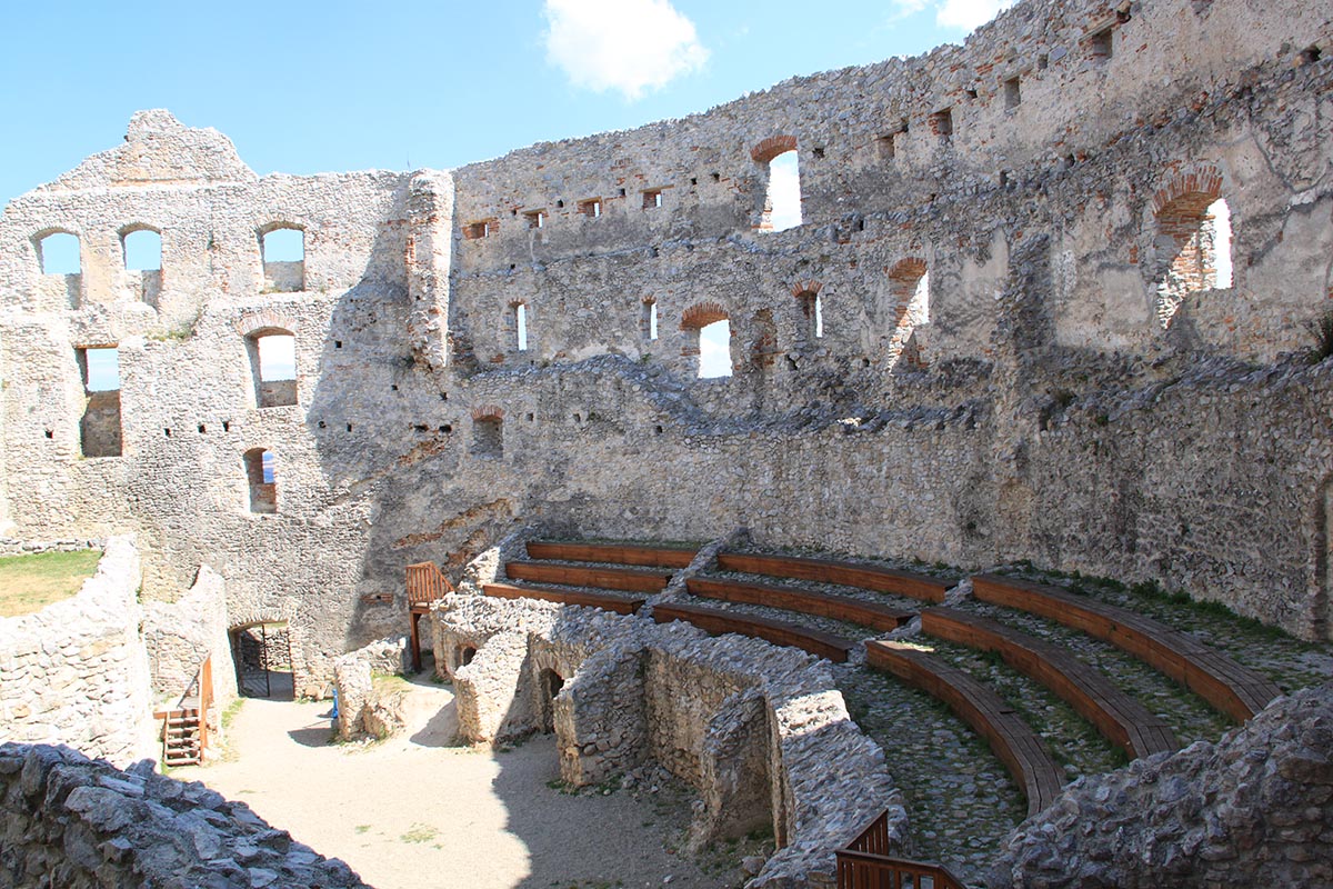 To mi svojím tvarom pripomína rímske koloseum, v strede s akoby bojiskom, kde kedysi bojovali rytieri. No a obvod bojiska vyzerá ako stvorené pre publikum (iste je to aj vec fantázie). Nádvorie tvorí z jednej strany poloblúk s lavičkami, na ktorých sa dá príjemne posedieť a v tieni kamenného opevnenia aj občerstviť.