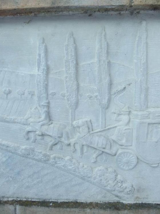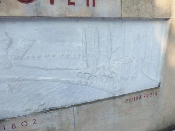 Z rozprávania pamätníka som sa dozvedel, že smerom na Šarkán viedla „Panská cesta“, po ktorej sa premávalo panstvo na kočoch. A tento výjav z plastiky presne sedí. A dá sa potvrdiť aj tým, že pamätník presne identifikoval, o ktorú teraz už zarastenú cestu sa jedná. A pri prechode z lokality Banka som cestu križoval. A je to tá na plastike, čo stúpa medzi topoľmi na kopec Šarkán.