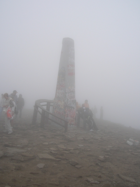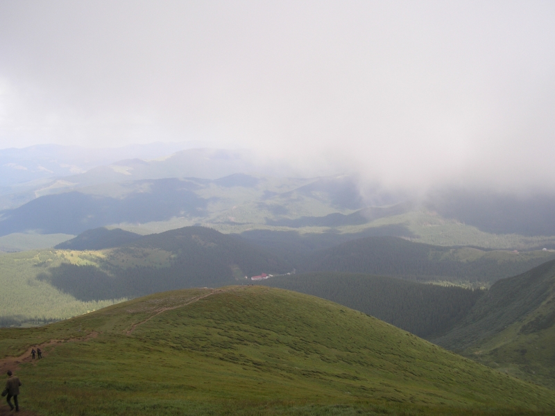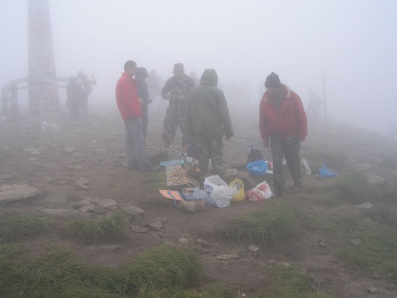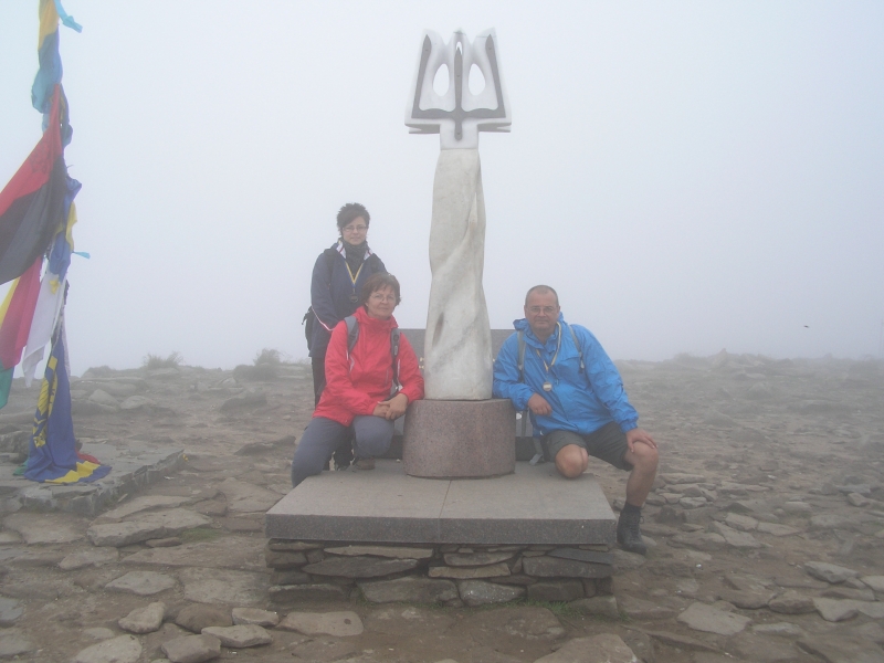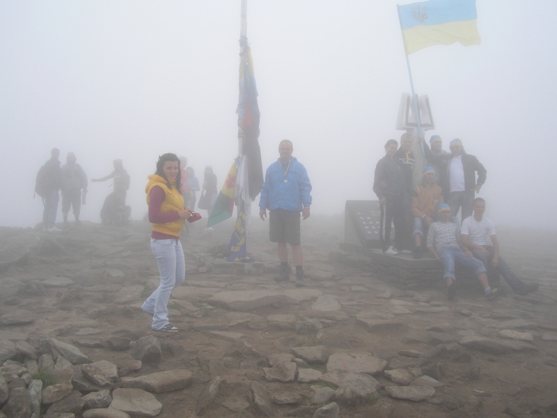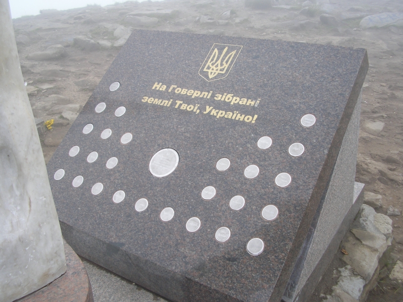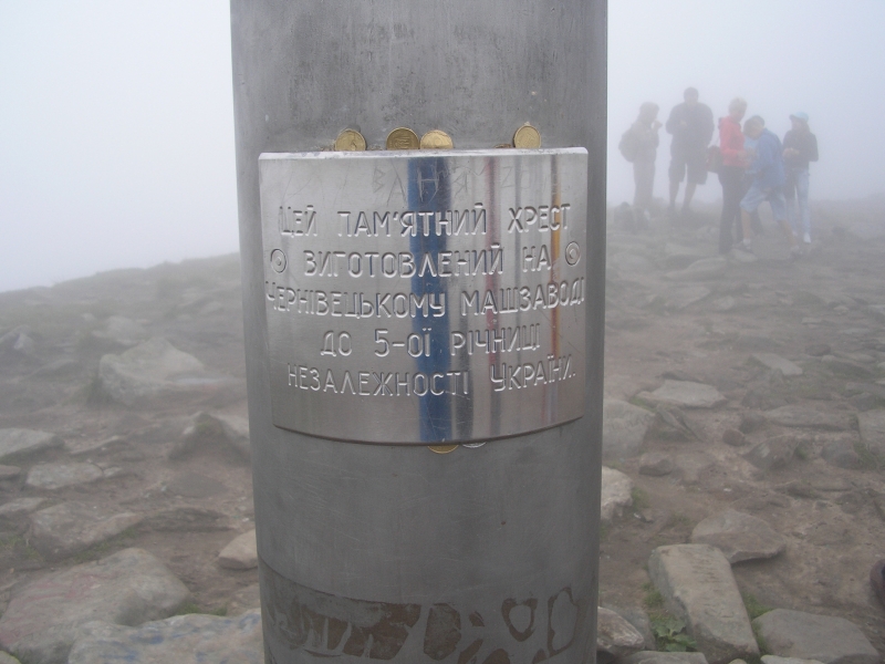 Pochopili sme hore. Na Hoverle je dosť miesta, nie ako u nás na Kriváni. Pokukali sme pamätníky, pofotili sme sa v rámci hmlistých možností. Ukrajinci mali hore neviem či organizovanú alebo len takú ľudovú službu. Predávali horúci čaj uvarený v okadených ešusoch, neviem z akej vody, či to hore nosili na chrbtoch alebo či tam kdesi bol prameň. A pred predavačmi čaju položená neohoblovaná doska a na nej medaile na predaj. S nápisom Hoverla 2011. No nekúp to. Doteraz sú v skrini uložené, nejako sme ich moc nenosili. Ale výstup na Hoverlu priniesol teda zopár momentov, keď je človek dobrovoľne ale aj nedobrovoľne okolnosťami dotlačený pustiť perie, ako sa hovorí na našom konci. Avšak aj poplatok za výstup, cena čaju na vrchole, medaila kúpená na vrchole má nejaký zmysel, nemáte pocit, že platíte len tak poplatok za nič.