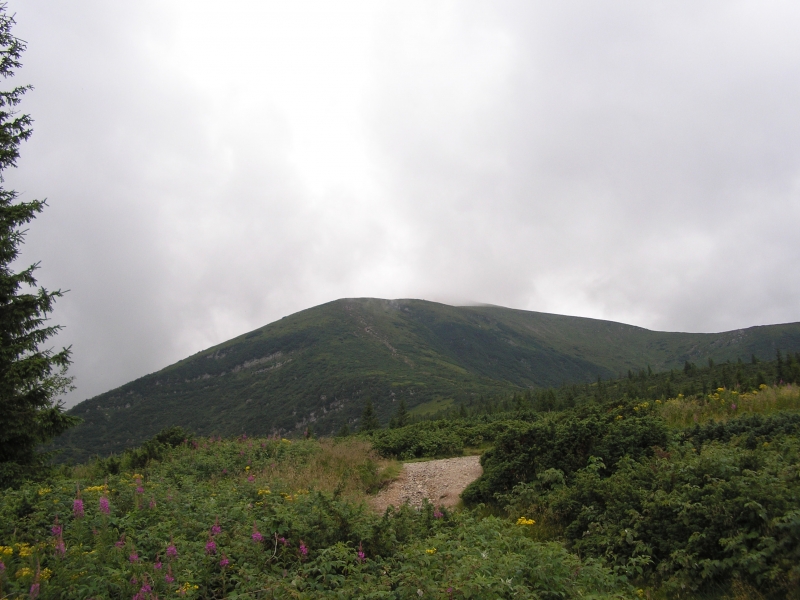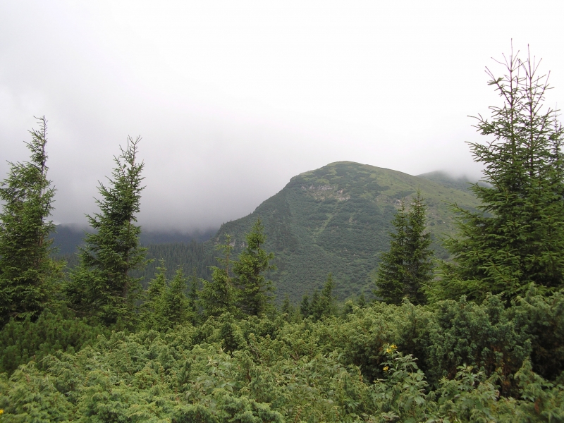 Zo začiatku sme stúpali popri potoku. Stretli sme aj skupinu Poliakov na koleskách, ale v prudšom stúpaní sa nejako postupne vytratili. Hoverla bola občas vidieť, občas trochu, občas celkom v hmle. O to bola lákavejšia a taká trochu aj tajomná. Stúpali sme hore a hore.