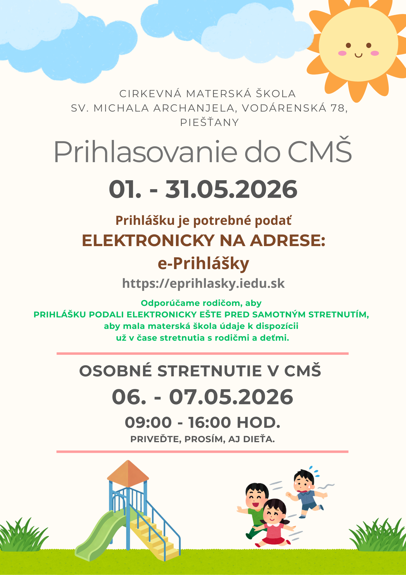 Prihlášky do materských škôl, podobne ako do základných, či stredných, sa od tohto roka podávajú elektronicky prostredníctvom portálu e-Prihlášky. Termín je od 1. do 31. mája. Pokiaľ rodičia nemajú takúto možnosť, prihlášku môžu podať aj osobne, počas plánovaných stretnutí v materských školách. V Cirkevnej materskej škole sv. Michala Archanjela je termín pre osobné stretnutia 6. a 7. máj 2026 v budove školy na Vodárenskej ulici 78 v Piešťanoch.