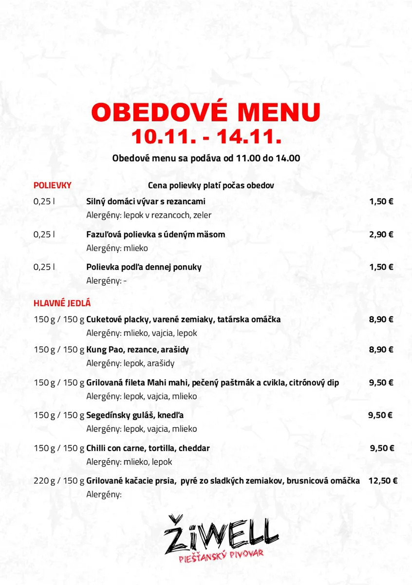 Obedové menu Pivovaru ŽiWell a ŽiWell Kursalonu 10.11. – 14.11.