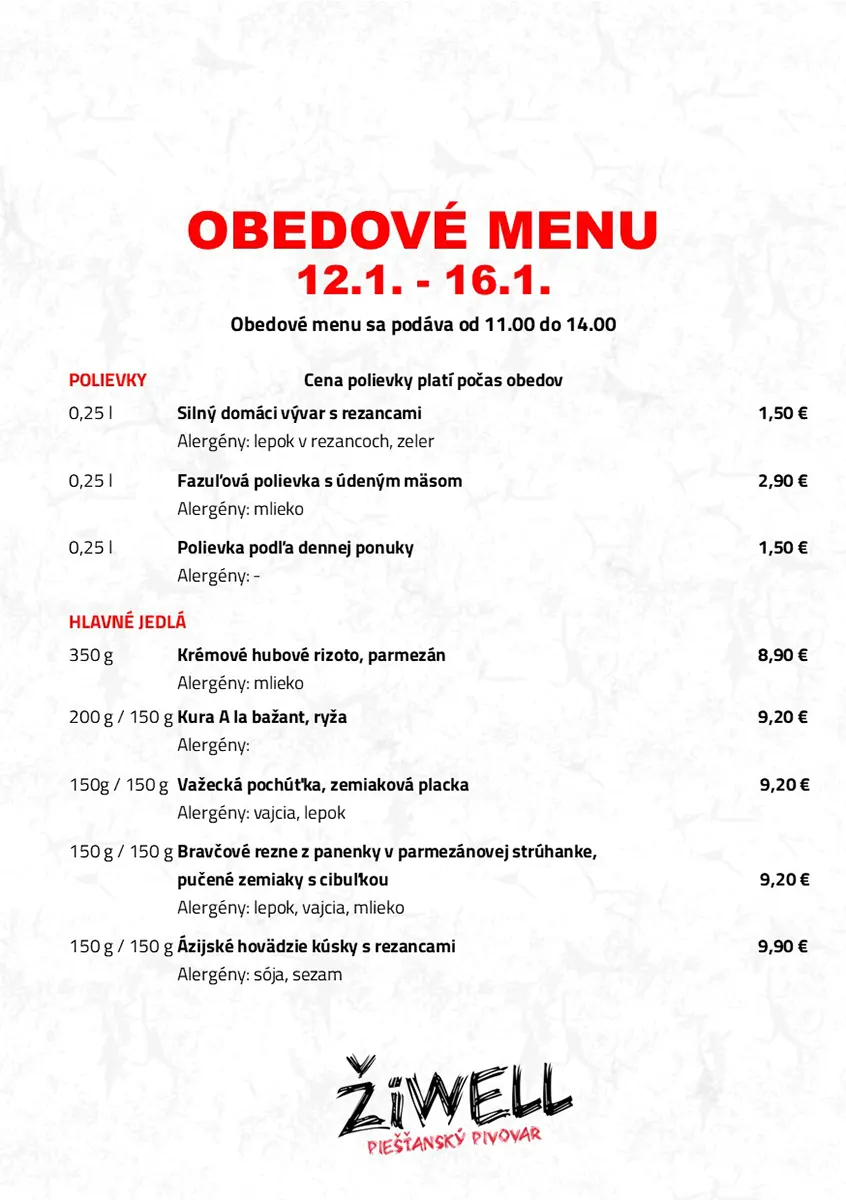 Obedové menu 12. januára až 16. januára 2026 Pivovar ŽiWell