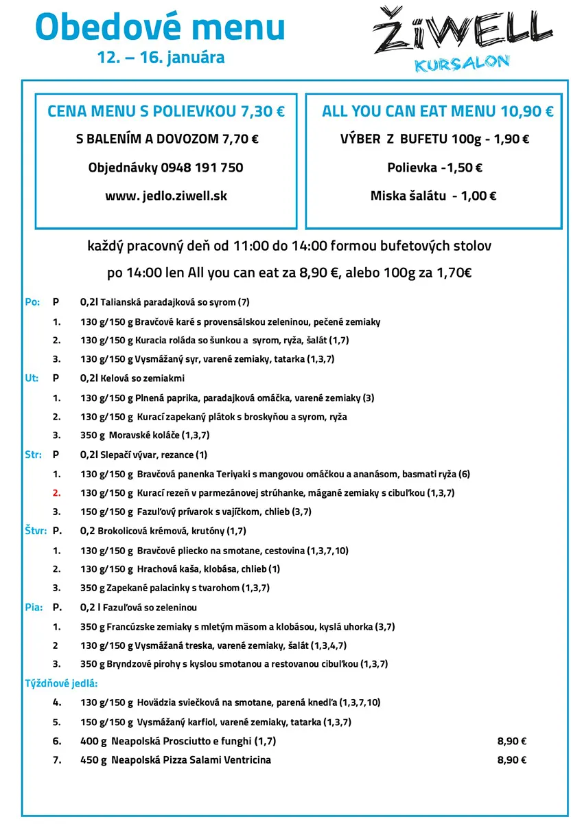 Obedové menu 12. januára až 16. januára 2026 ŽiWell Kursalon