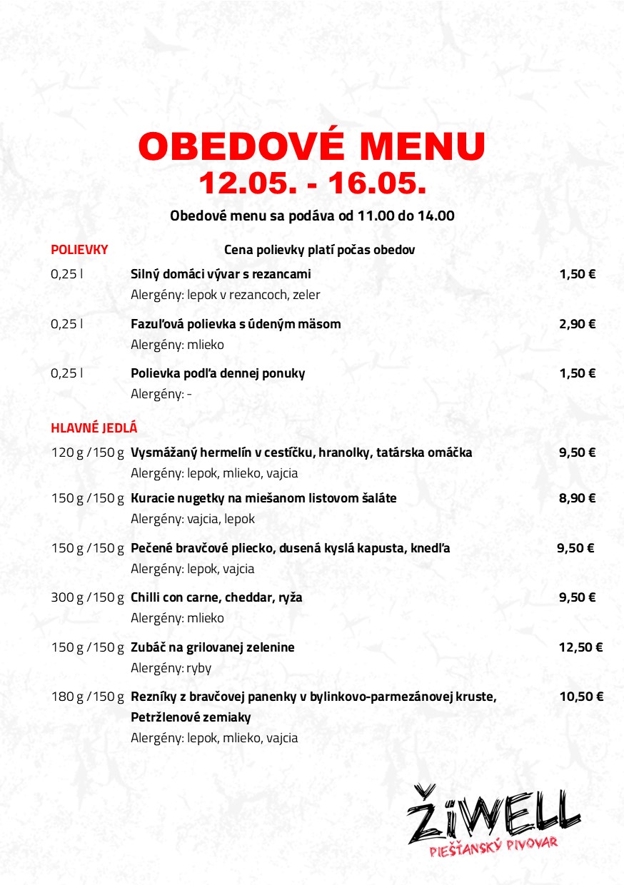 Obedové menu Pivovar ŽiWell 12.5. - 16.5.2025