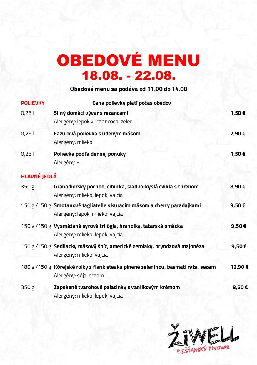 Obedové menu Pivovaru ŽiWell a ŽiWell Kursalonu 18.8. – 22.8.