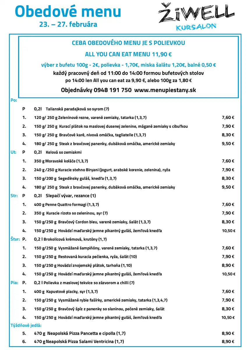 Obedové menu 23. februára až 27. februára 2026 ŽiWell Kursalon