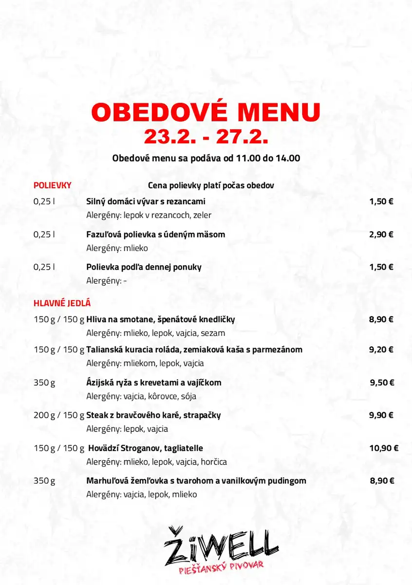 Obedové menu 23. februára až 27. februára 2026 Pivovar ŽiWell