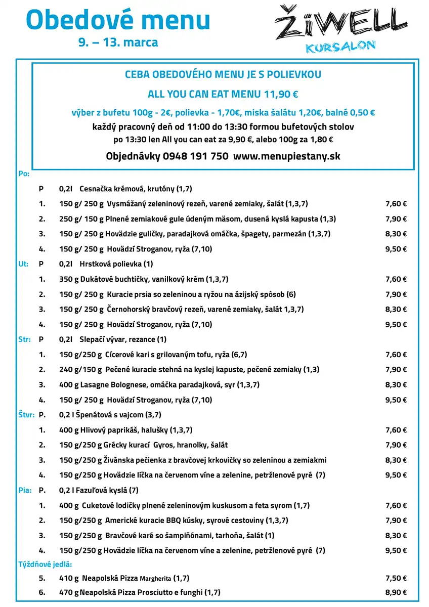 Obedové menu 9. marca až 13. marca 2026 ŽiWell Kursalon