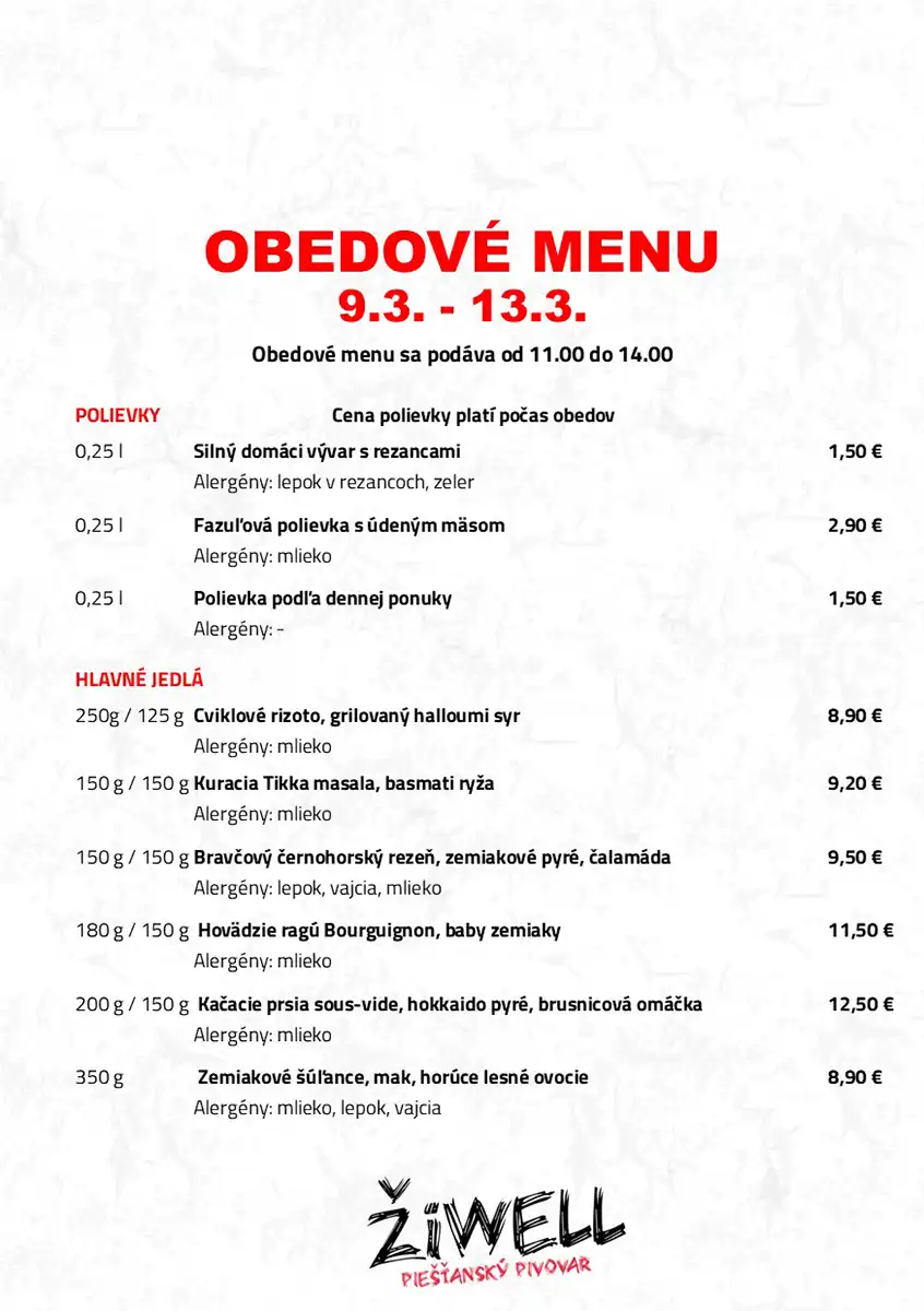 Obedové menu Pivovaru ŽiWell a ŽiWell Kursalonu 9.3. – 13.3.2026