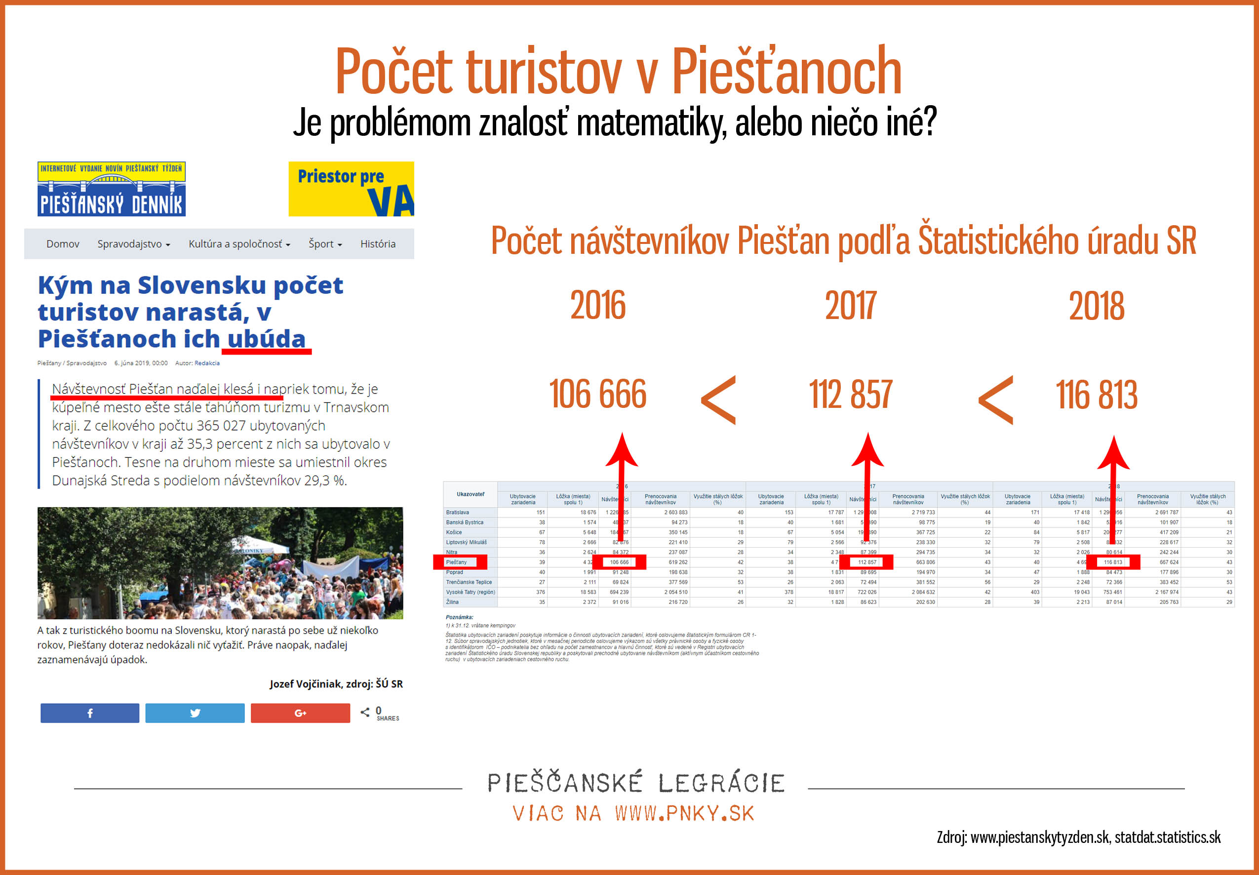 Tento raz sa venujeme malej edukácii. Jeden piešťanský týždenník, respektíve jeho šéfredaktor, opakovane publikuje články o tom, že počet návštevníkov Piešťan klesá. Ako zdroj uvádza Štatistický úrad SR. Stačí však kliknúť na jeho stránku, ovládať matematiku základnej školy a výsledok je úplne iný. Problémom môže byť matematika, ale aj miešanie hrušiek s jabĺčkami (vzťahovanie dát okresu na Mesto Piešťany).