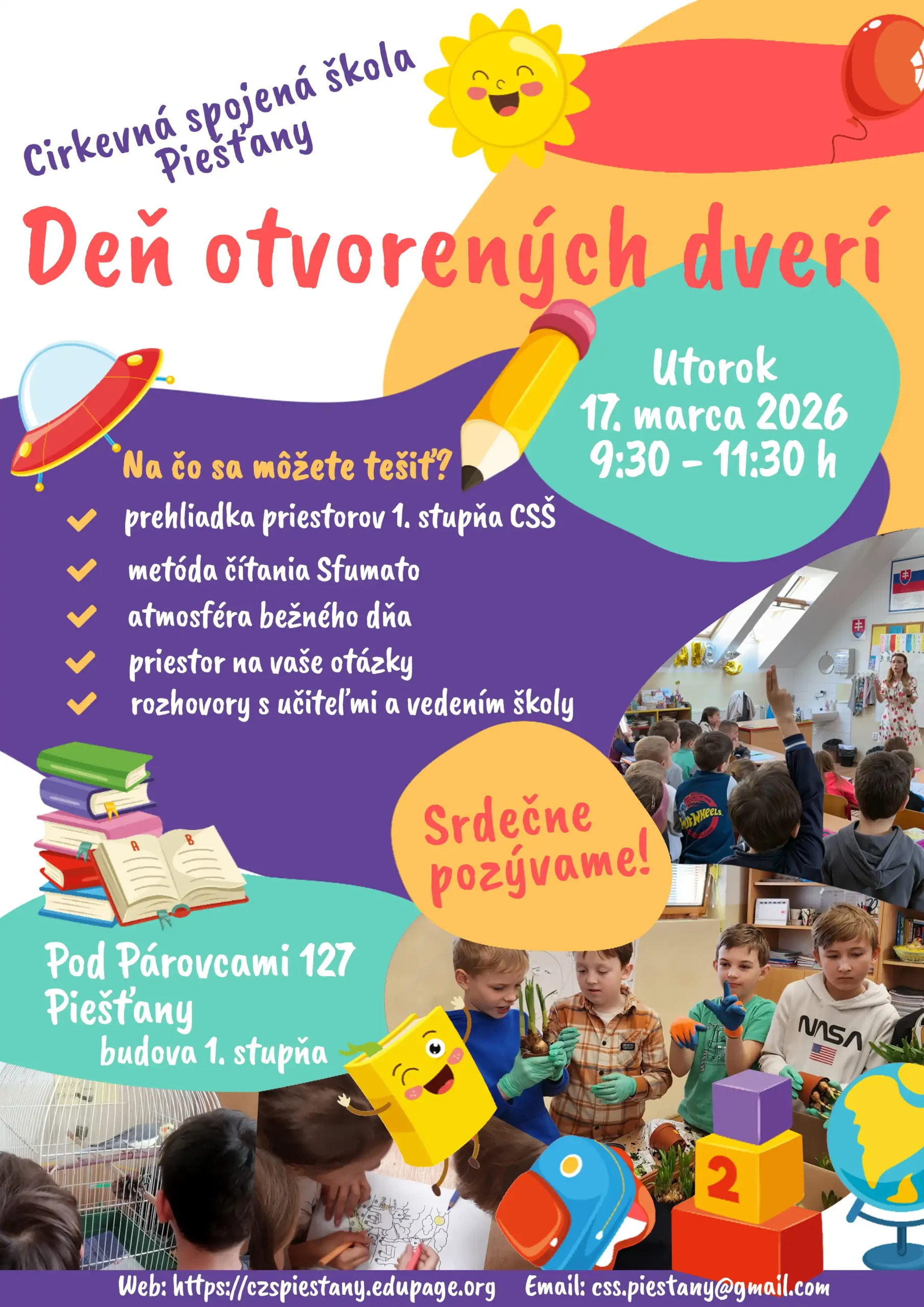 Čaká vás rozhodnutie kam zapíšete svojho budúceho prváčika? Cirkevná spojená škola v Piešťanoch je v rámci mesta jednou z možností. Ako sa vraví, lepšie je raz vidieť ako sto ráz počuť, aj preto pre vás v škole pripravili Deň otvorených dverí. Uskutoční sa v stredu 17. marca na I. stupni v budove na ulici Pod Párovcami. Rodičia budúcich prváčikov tak budú mať možnosť pozrieť si priestory školy, vidieť priebeh vyučovania, zažiť atmosféru bežného dňa, ale aj vidieť a počuť ako je možné učiť sa čítať prostredníctvom metódy Sfumato.