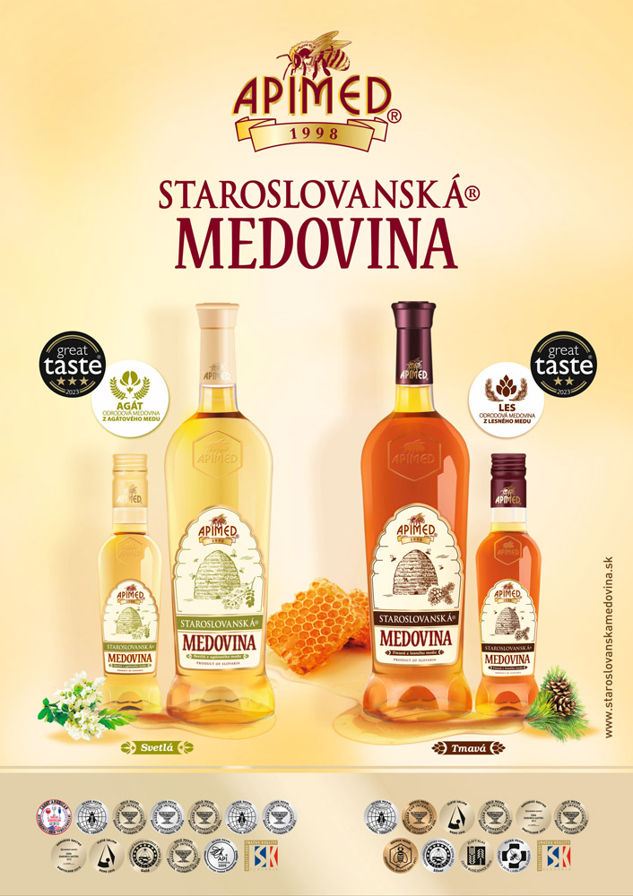 Medoviny APIMED dosiahli to najvyššie možné ocenenie 3 hviezdy za Staroslovanskú medovinu svetlú z agátového medu a 2 hviezdy za Staroslovanskú medovinu tmavú z lesného medu.