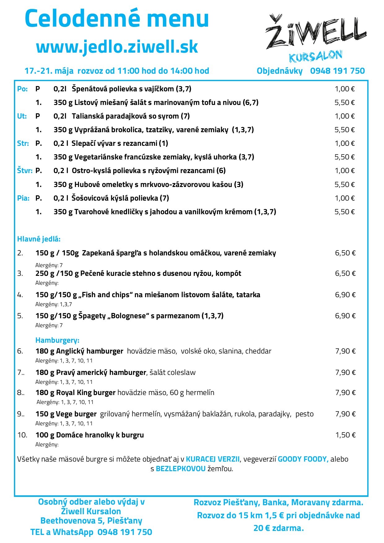 Rozvoz po Piešťanoch, Banke a Moravanoch nad Váhom je zdarma. Do 15 km stojí 1,5 eur a pri objednávke nad 20 eur je tiež zdarma. Celú ponuku nájdete na https://jedlo.ziwell.sk. Objednávať môžete aj cez WhatsApp 0949 409 900.