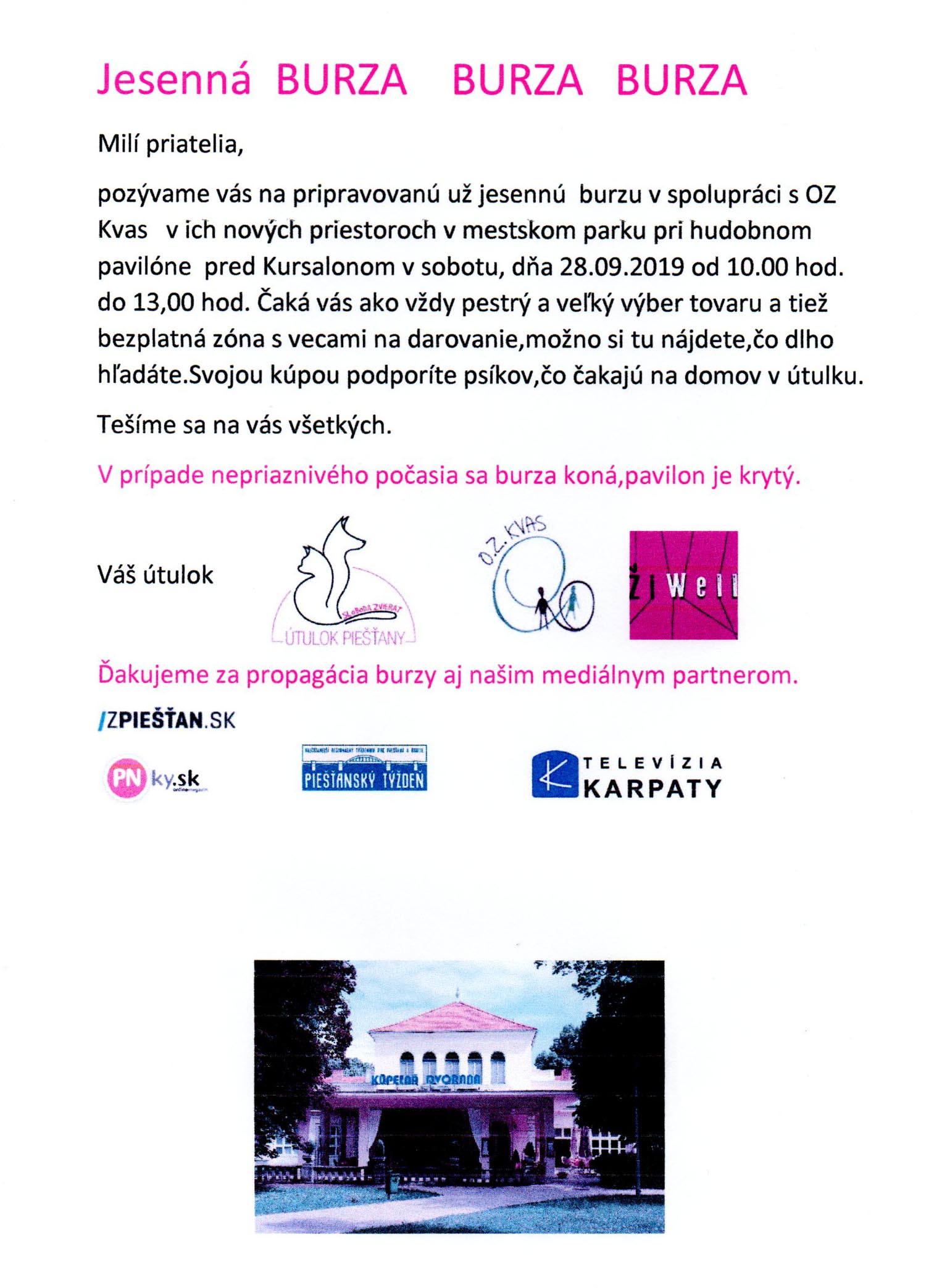 Psíkom v piešťanskom Útulku môžete pomôcť svojim nákupom. Už túto sobotu 28. septembra sa na terase Kursalonu uskutoční Jesenná burza, ktorej výťažok poputuje pre psíkov čakajúcich na svoj nový domov. Akcia je realizovaná v spolupráci s OZ Kvas.