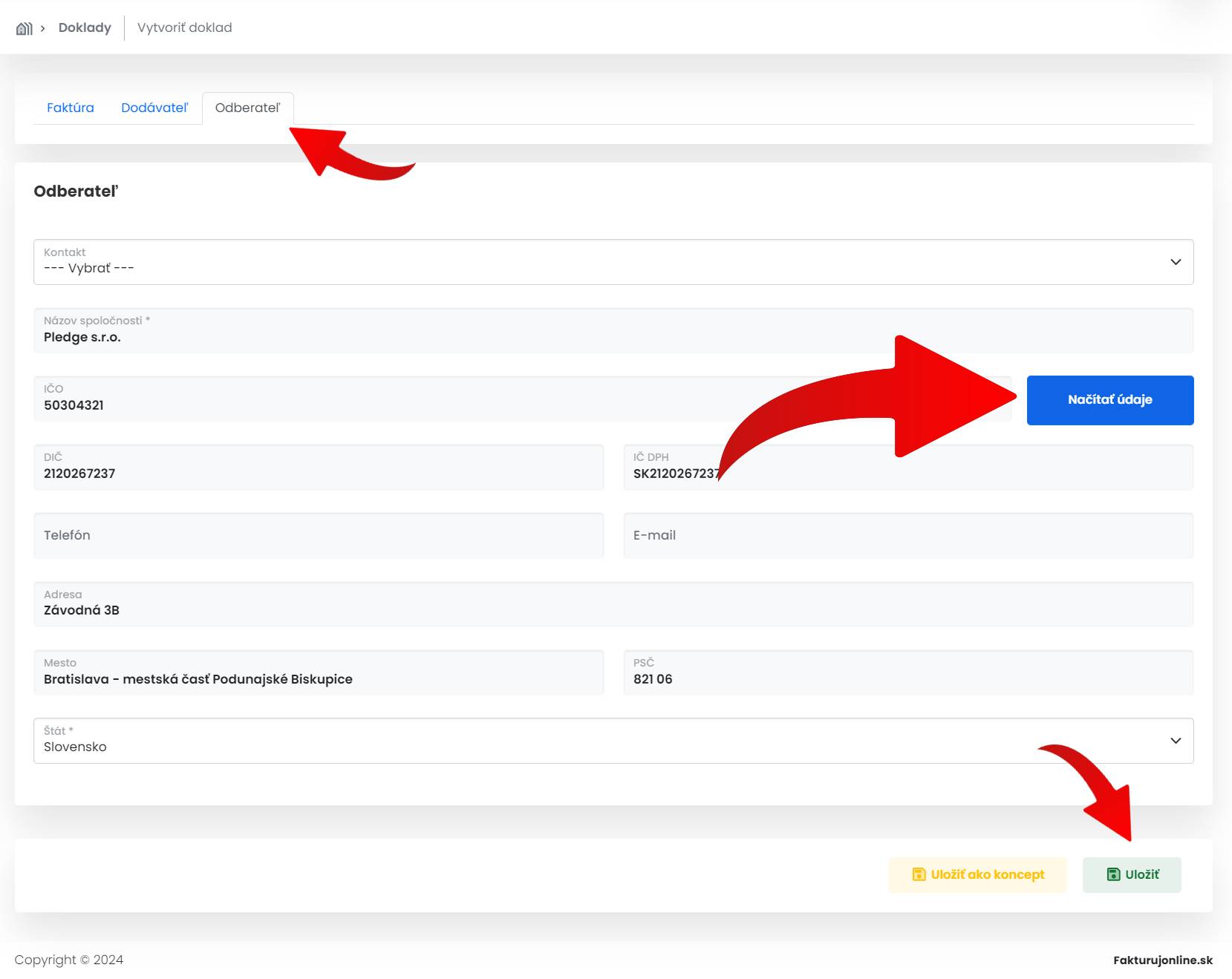 V ďalšom kroku na karte Odberateľ vyplníte príjemcu tovaru, resp. služby. Môžete tak urobiť cez načítanie dát cez IČO, prípadne cez funkciu kontaktov, ak ste si vášho obchodného partnera uložili medzi partnerov, alebo údaje môžete vyplniť manuálne. Potom faktúru stačí uložiť. Dostupnú ju budete mať v profile vašej firmy.