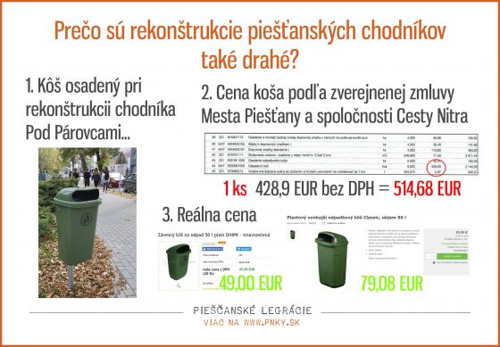 Čo poviete celkom pekný zárobok firmy na jednom smetiaku 514,68 eur – 79,08 eur = 435,6 eur. Keďže je ich je osadených 5 celkovo, Cesty Nitra, alebo možno v konečnom dôsledku niekto iný, si prilepšil minimálne o 2178 eur. Presne o toľko majú Piešťanci menej na iné potrebné veci a aj preto sú chodníky také drahé. Ak by sa odborníci pozreli na rozpočet, ktorý je súčasťou zmluvy, určite ich zaujmú aj iné položky.