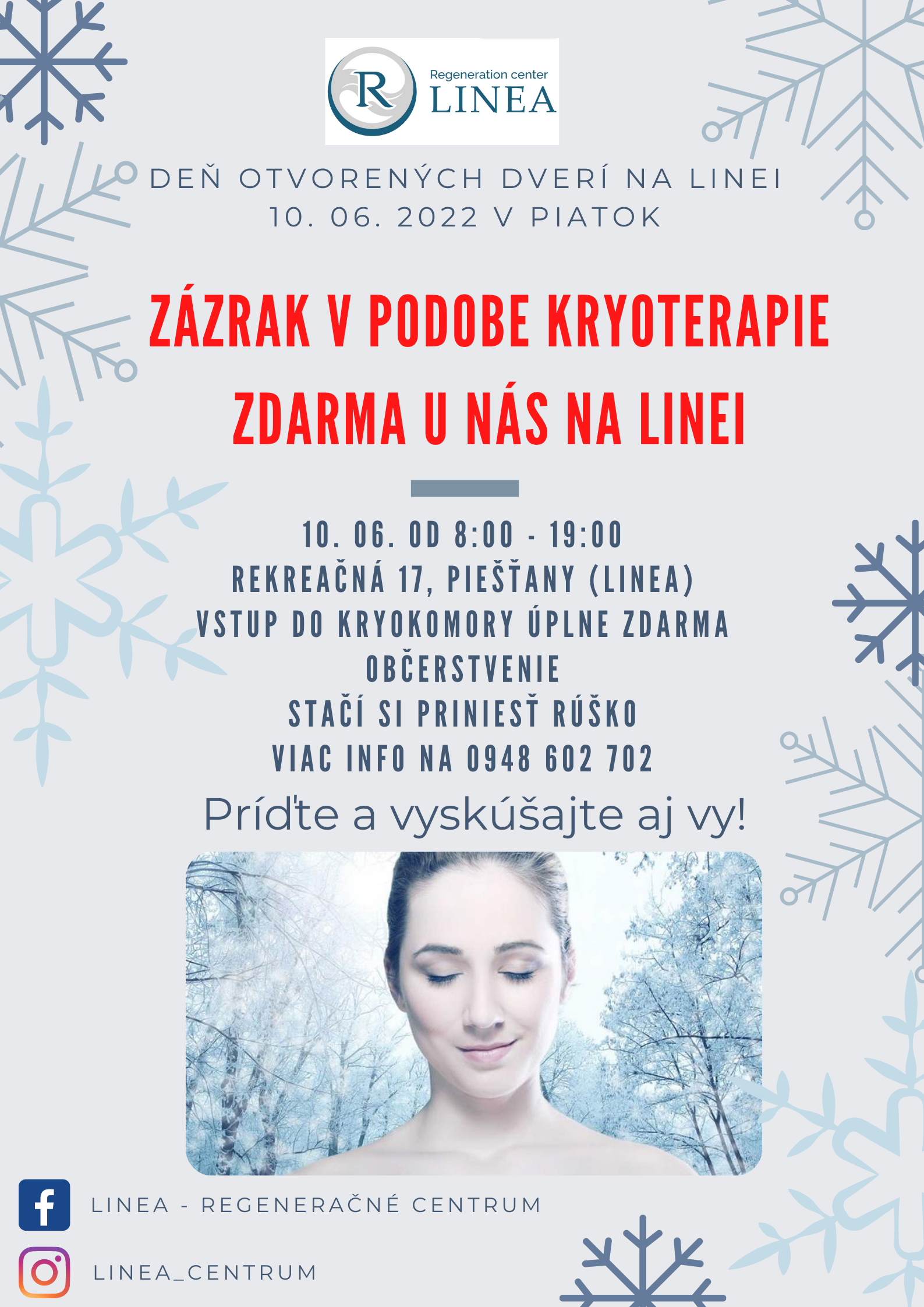 O pár dní máte jedinečnú príležitosť vyskúšať kúzlo kryokomory. V piatok 10.6. je deň otvorených dverí LINEA. Kryokomora bude celý deň k dispozícii zdarma. Začíname už o 8:00 až do večera do 19:00.