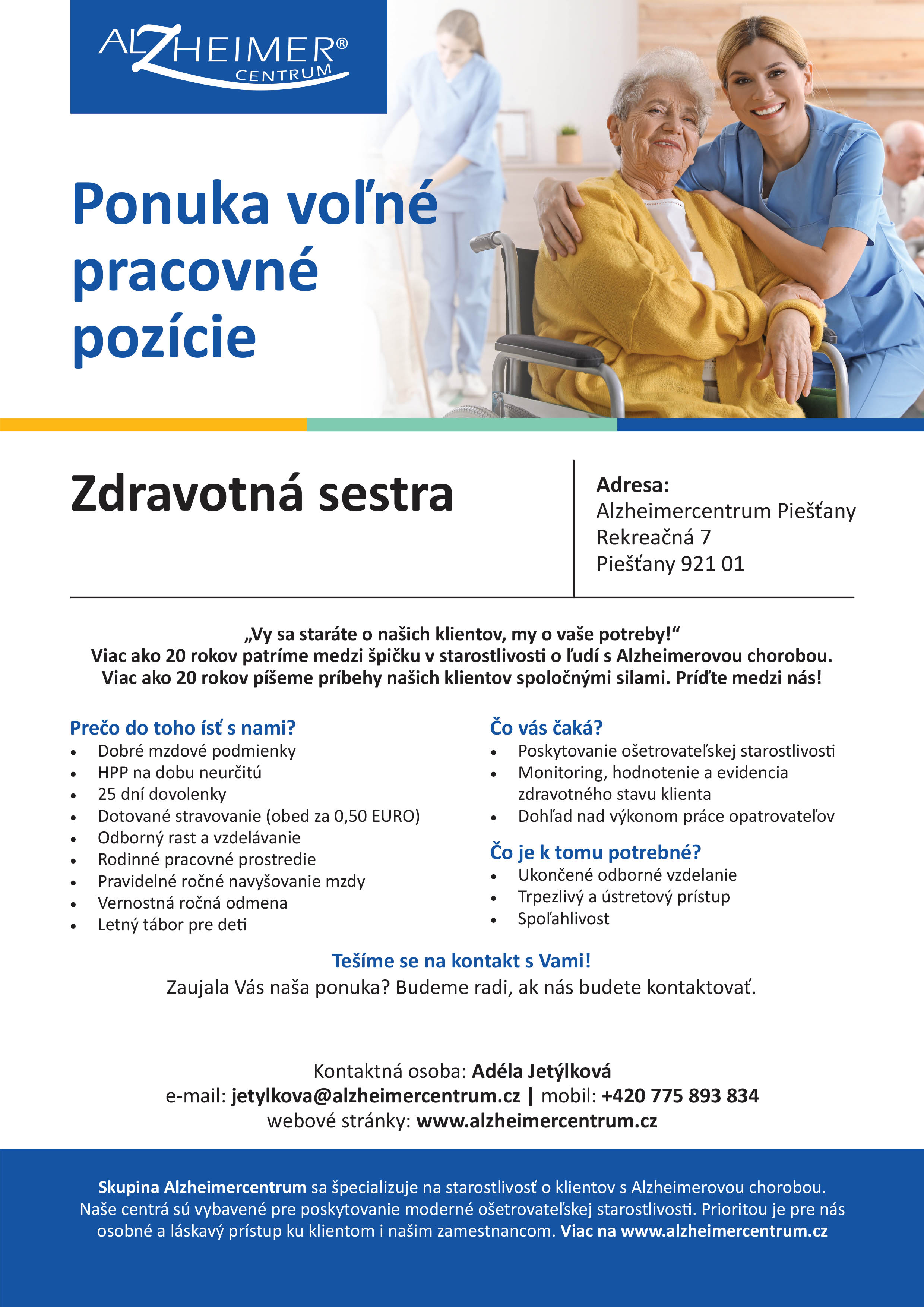 Alzheimercentrum špecializované na starostlivosť o klientov s Alzheimerovou chorobou ponúka voľné pracovné pozície zdravotná sestra, opatrovateľ a opatrovateľka.