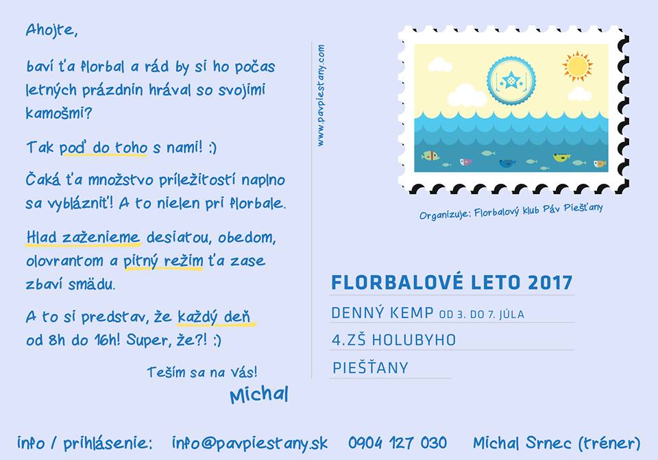 Klub FBC Páv Piešťany chystá v termíne od 3. do 7. júla Florbalové leto 2017, ktoré umožní deťom naučiť sa základy floralu, zdokonaliť sa v technike a zažiť kopu zábavy so svojimi kamarátmi. Organizátori denného tábora sa postarajú o jedlo i pitný režim, pričom dohľad nad športovými činnosťami zabezpečí tréner a bývalý hokejový reprezentant Michal Srnec. Deti čaká množstvo zážitkov, pričom každý deň môžu v kempe stráviť čas od 8.00 do 16.00 hodiny. Výučba florbalu bude prebiehať v priestoroch na Základnej škole Holubyho. Viac informácií získate prostredníctvom mailu na adrese info@pavpiestany.sk, prípadne na telefónnom čísle 0904 127 030.