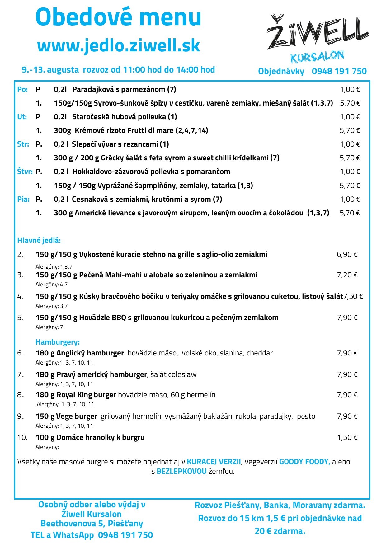 Rozvoz po Piešťanoch, Banke a Moravanoch nad Váhom je zdarma. Do 15 km stojí 1,5 eur a pri objednávke nad 20 eur je tiež zdarma . Celú ponuku nájdete na https://jedlo.ziwell.sk . Objednávať môžete aj cez WhatsApp 0949 409 900.