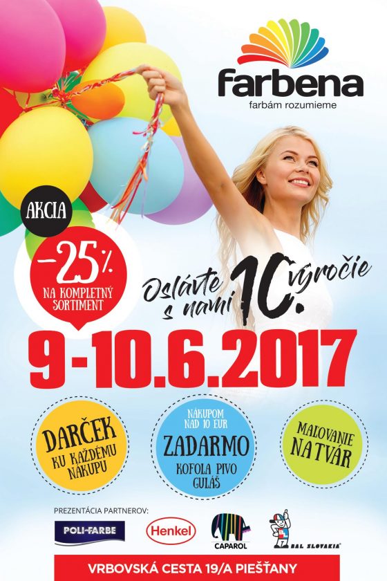 Spoločnosť Farbena oslavuje desiate výročie svojho vzniku. Pri tejto príležitosti pripravila na 9. a 10. júna zaujímavú akčnú ponuku -25 percent na celý sortiment, ale aj darčeky k nákupom, guláš, pivo a kofolu zdarma, či pre deti maľovanie na tvár.