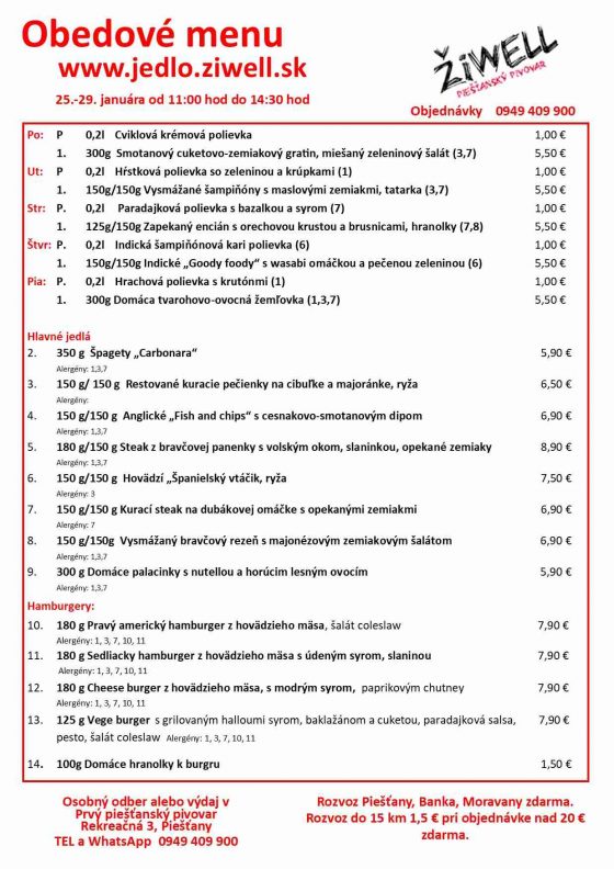 Jedlo si môžete objednať na rozvoz alebo osobný odber (Rekreačná 3). Piešťanský pivovar ŽiWell pripravil pestrý výber, na svoje si prídu aj vegetariáni.