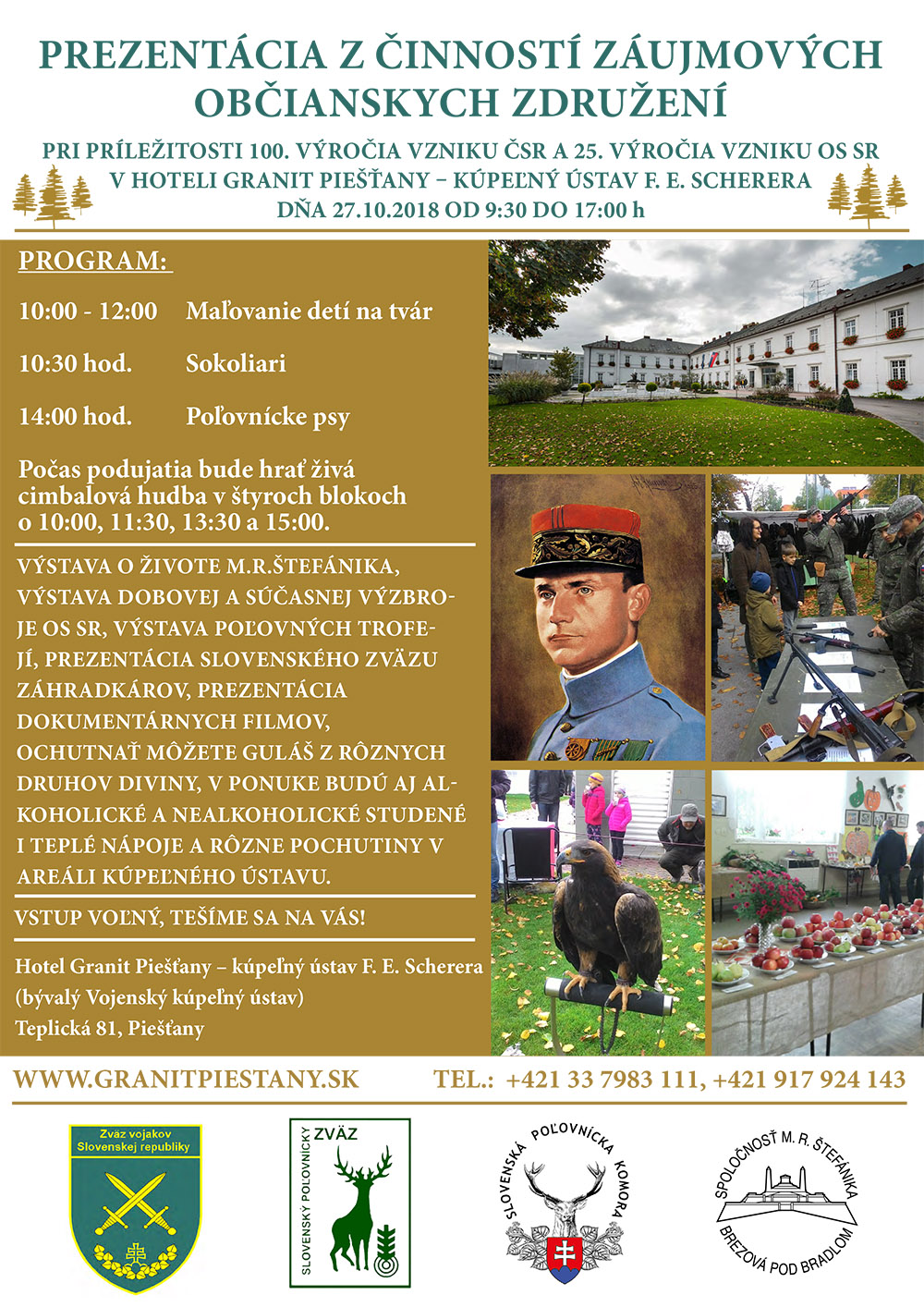 V sobotu 27. októbra navštívte Hotel Granit Piešťany – kúpeľný ústav, kde na vás čaká zaujímavý, takmer celodenný, program pri príležitosti 100. výročia vzniku ČSR a 25. výročia vzniku Ozbrojených síl Slovenskej republiky. Prezentovať sa budú rôzne občianske združenia