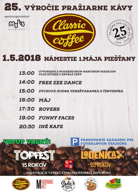 Pražiareň kávy Classic Coffee oslavuje tento rok 25. výročie svojho vzniku. Okrúhle 15. výročie má aj Topfest a 20 rokov festival Lodenica. Spojenie jubilantov vám prináša 1. mája na Námestie 1. mája pred Classic Coffee zaujímavý program a výnimočnú prvomájovú oslavu.