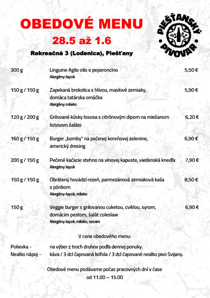 Na obed môžete zájsť od mája už aj do pivovaru. Piešťanský pivovar ŽiWell ponúka obedové menu, ktoré tvorí tento týždeň sedem jedál a vybrať si môžete tiež z troch polievok podľa dennej ponuky. V cene je i káva, alebo kofola, či nealko pivo Svijany. Ponuka druhov jedál sa mení v týždňových intervaloch.