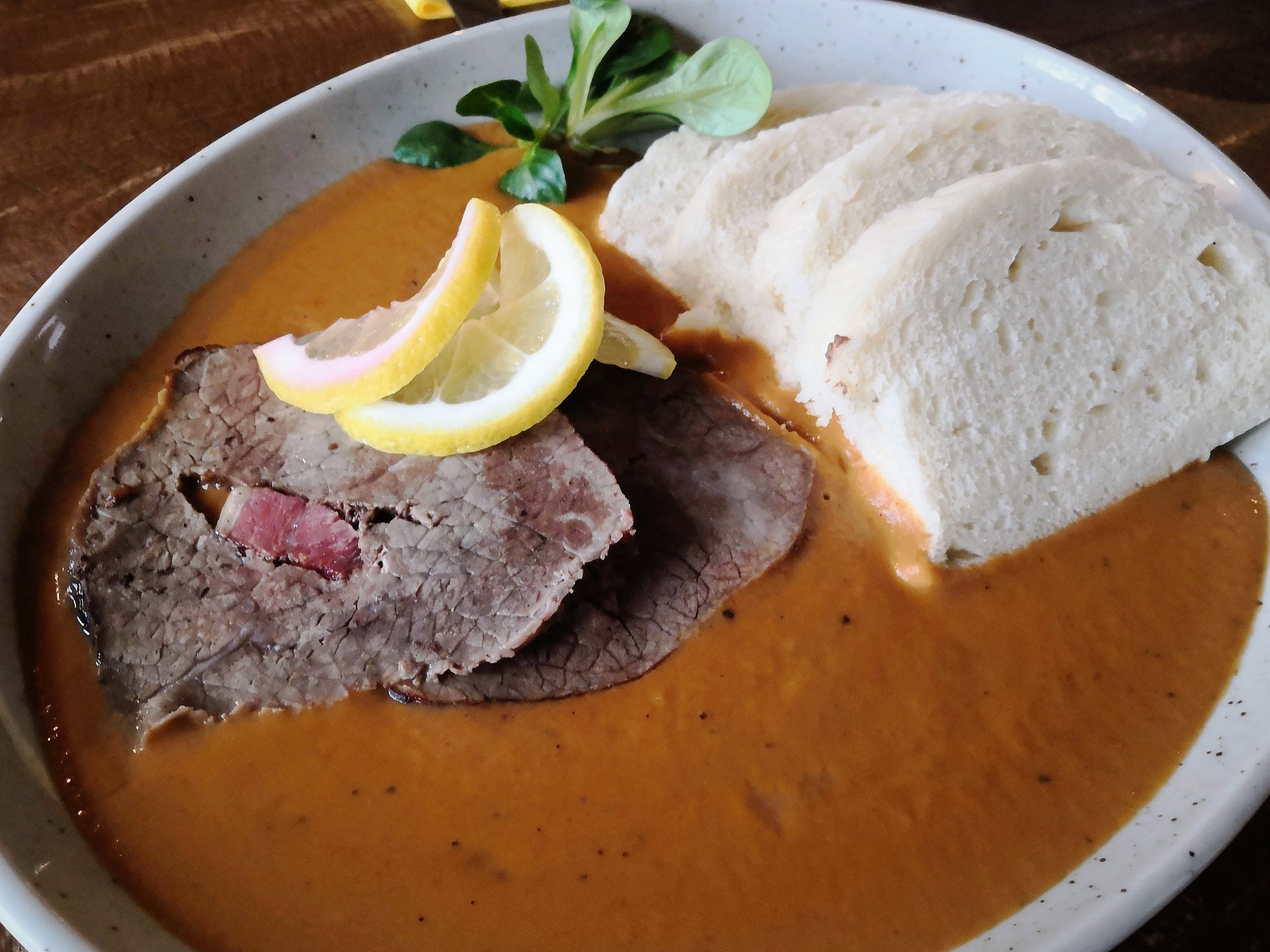 150 g / 150 g Pečená špikovaná sviečková na smotane, domáca knedľa 7,50 €