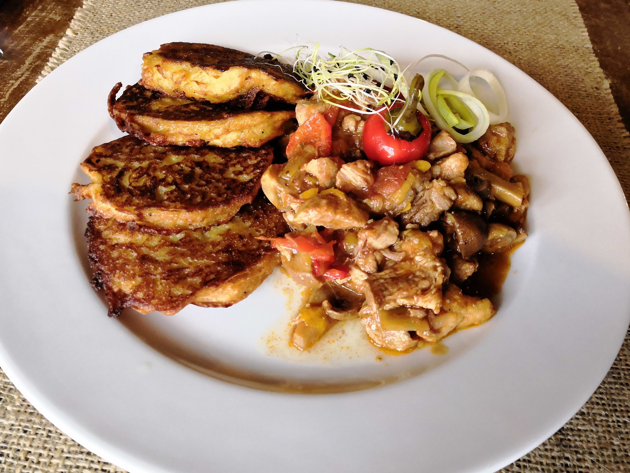 150 g / 150 g Pikantné bravčové soté s domácimi zemiakovými rosti 6,00 €