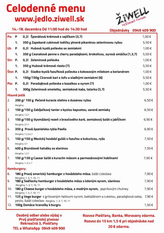 Celú ponuku nájdete na https://jedlo.ziwell.sk. Od 14. do 18. decembra prebieha rozvo v čase od 11.00 do 14.30 h.