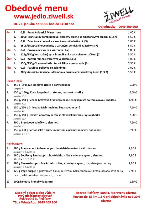 Jedlo si môžete objednať na rozvoz alebo osobný odber (Rekreačná 3). Piešťanský pivovar ŽiWell pripravil pestrý výber, na svoje si prídu aj vegetariáni.