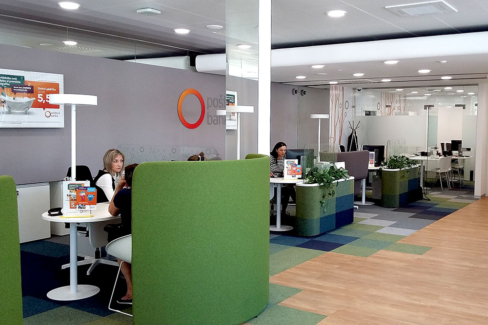 Všetky naše pobočky sú navrhnuté dizajnérom, ktorý si dal záležať nielen na vizuálnej stránke, ale taktiež dbal na komfort a celkovú atmosféru. Klienti tu dostanú výbornú kávu, ktorú, ako tvrdí riaditeľ piešťanskej pobočky, varí on sám :-) Poštová banka sa navyše snaží fungovať ekologicky, teda na pobočke nájdete iba živé kvety, recyklovaný papier, žiadne plastové poháre alebo fľaše. Snažíme sa fungovať čo najviac v súlade s prírodou a je to na celkovej atmosfére pobočky cítiť. Zároveň veľmi intenzívne pracujeme na zákazníckom zážitku. Klienti majú mať v banke príjemný pocit. Chceme im byť partnerom, nie otlakom na nohe.