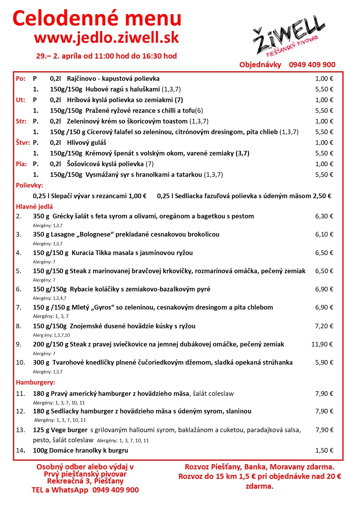 Piešťanský pivovar ŽiWell spustil e-shop, ktorý umožňuje expresné objednávky z celotýždňového menu. Jedlo si môžete objednať na rozvoz alebo osobný odber (Rekreačná 3). Piešťanský pivovar ŽiWell pripravil pestrý výber, na svoje si prídu aj vegetariáni. Rozvoz po Piešťanoch, Banke a Moravanoch nad Váhom je zdarma. Rozvoz do 15 km stojí 1,5 eur a pri objednávke nad 20 eur je tiež zdarma. Celú ponuku nájdete na https://jedlo.ziwell.sk. Objednávať môžete aj cez WhatsApp 0949 409 900.