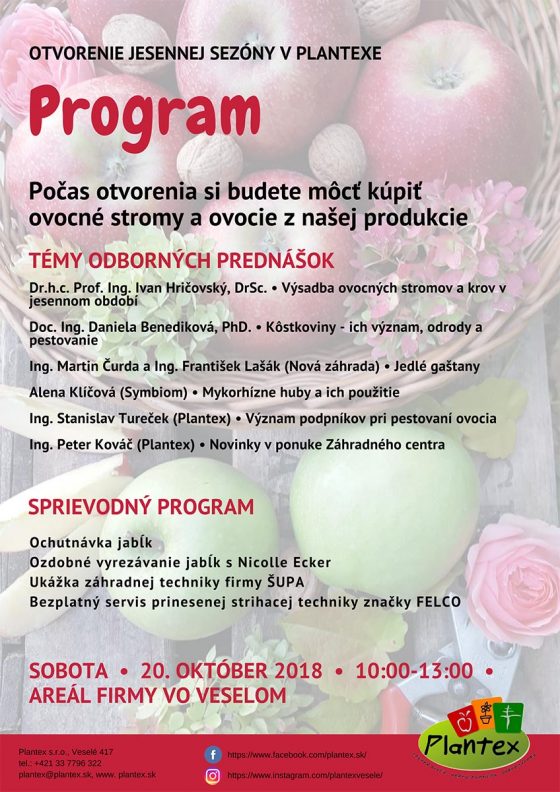 Jeseň je nádherným obdobím, kedy príroda hrá všetkými farbami a kedy záhradkári pozbierajú vo svojich záhradách úrodu, orežú stromy, či doplnia voľné miesto zaujímavou drevinou. Tento rok pre vás v spoločnosti Plantex vo Veselom pripravili opäť tradičné Otvorenie jesennej sezóny, na ktorom si budete môcť vypočuť zaujímavé odborné prednášky, prezrieť a vyskúšať záhradnú techniku, či ochutnať jablká a využiť možnosť nákupu za akciové ceny.