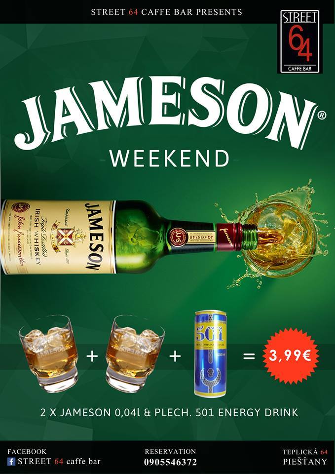 V piešťanskom Street 64 Caffe Bare pre vás pripravili sa na blížiaci víkend opäť zaujímavú akciu. Dvakrát JAMESON 0,04 l a k tomu Energy 501 kúpite iba za 3, 99 €! Tak príďte a spojte zábavu s jedinečnou chuťou Irish Whiskey! Tešíme sa na vás (10.4. – 12.4. 2015).