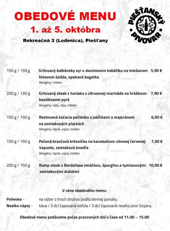 Zájdite na obed do pivovaru. Piešťanský pivovar ŽiWell ponúka obedové menu, ktoré tento týždeň tvorí päť jedál a vybrať si môžete tiež z troch polievok podľa dennej ponuky. V cene je i káva, alebo kofola, či nealko pivo Svijany. Ponuka druhov jedál sa mení v týždňových intervaloch. Tento týždeň sú pre vás pripravené jedlá, ktoré ste v pivovare ešte nemali, preto príďte na obed, či večeru ochutnať marinovaný steak z tuniaka, či kačaciu pečienku s jablkami alebo niečo „ľahšie“ balkánsky syr v slaninke.