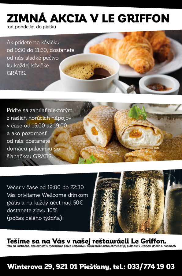 Reštaurácia Le Griffon, ktorá je v hodnotení tripadvisor.com jednotkou v Piešťanoch, pre vás pripravila Zimnú akciu. Dopriať si môžete grátis chutné sladké pečivo, plnenú palacinku, či welcome drink.