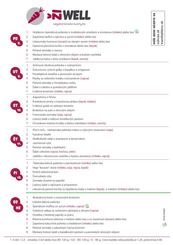 V komunitnom centre ŽiWell si môžete dopriať zdravé a chutné jedlo. Pri tvorbe vegetariánskych jedál, na ktorých si však pochutia nielen vegetariáni, tu kladú veľký dôraz na použitie zdravých a kvalitných surovín. Jedlo si môžete nechať priviezť domov či na pracovisko. Tento týždeň od 15. do 21.10. si môžete dopriať vrámci ŽiWell menu napríklad guľky s rajčinovou omáčkou, kari s ryžou, rezeň so zemiakmi či iné kombinácie podľa vašej chute. Tak neváhajte a príďte a výnimočný obed.