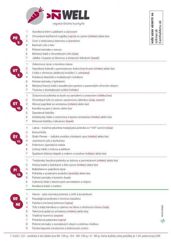 V komunitnom centre ŽiWell si môžete dopriať zdravé a chutné jedlo. Pri tvorbe vegetariánskych jedál, na ktorých si však pochutia nielen vegetariáni, tu kladú veľký dôraz na použitie zdravých a kvalitných surovín. Jedlo si môžete nechať priviezť domov či na pracovisko. Tento týždeň od 8.10. do 14.10. si môžete dopriať vrámci ŽiWell menu napríklad Špenátové halušky, ši Kelové kofty alebo Laksu. Tak neváhajte a príďte a výnimočný obed.