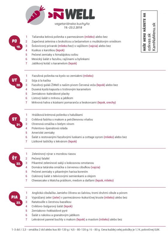 Kuchyňa komunitného centra ŽiWell v Piešťanoch kladie pri tvorbe vegetariánskych jedál veľký dôraz na zdravé a kvalitné suroviny. Jedlo si môžete nechať priviezť domov i na pracovisko, nižšie nájdete detailnejší popis, ako si správne objednať a tiež číslo na donáškovú službu. Tento týždeň pripravili pre vás zaujímavé prílohy, sýte polievky aj vege variácie na tradičné mäsové pochúťky. Dobrú chuť!