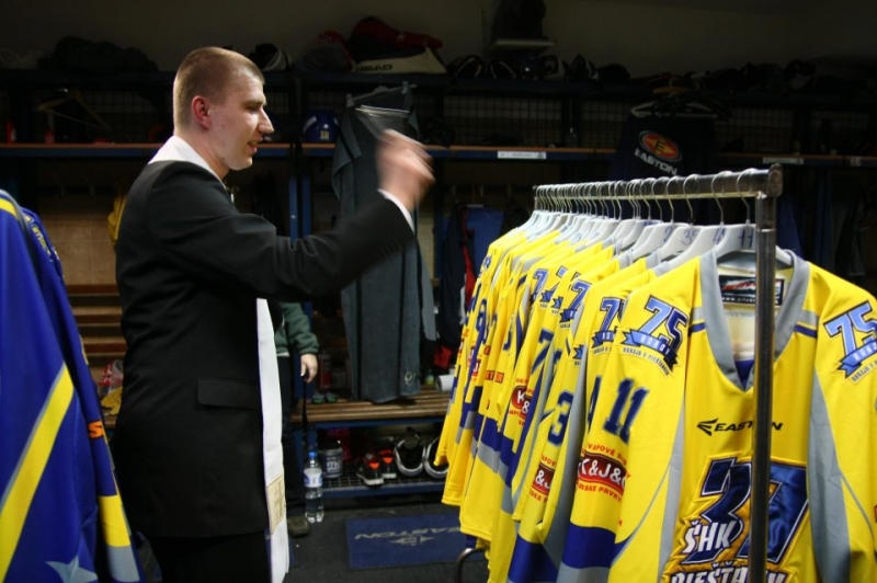 Piešťanskí hokejisti nastúpia do finále prvej hokejovej ligy v dresoch posvätených kňazom. Nové dresy pokropil svätenou vodou piešťanský kaplán z farnosti sv. Štefana Marián Kolenčík vo štvrtok 1. marca. Piešťanskí hokejisti i fanúšikovia veria, že im aj tento úkon pomôže zdolať tím HC 46 Bardejov.