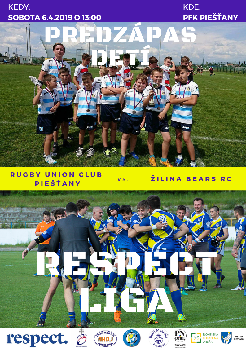 Príďte podporiť piešťanských rugbistov v súboji o Respect ligu proti Žilinským medveďom! Začiatok už o 13:00 predzápasom našich mladých nádejí! Následne nastúpia muži do prvého domáceho 15´s zápasu na PFK štadióne!