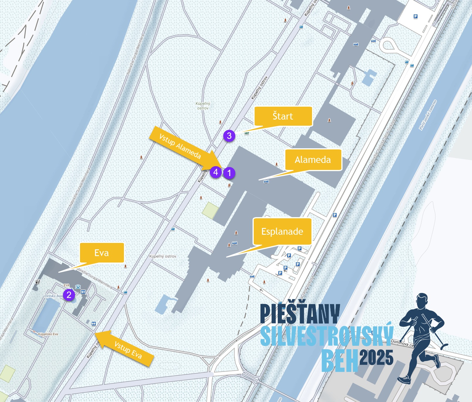 |1| – 📍 – Prezentácia a prihlasovanie (30.12. od 13:00) – krídlo ALAMEDA |2| – 📍 – Šatne, sprchy, toalety, bazén – Kúpalisko Eva |3| – 📍 – Štart / Cieľ |4| – 📍 – Vyhlasovanie výsledkov